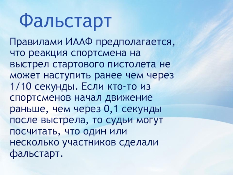может наступить ранее чем через 1/10 секунды. Если кто-то из спортсменов начал движение раньше, чем через 0,1 секунды после выстрела, то судьи могут посчитать, что один или несколько участников сделали фальстарт.