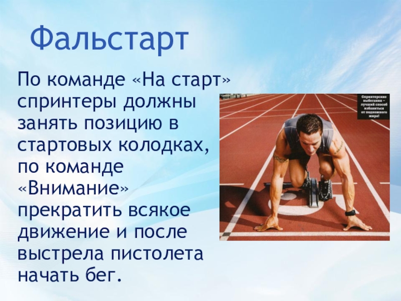 По команде «На старт» спринтеры должны занять позицию в стартовых колодках,