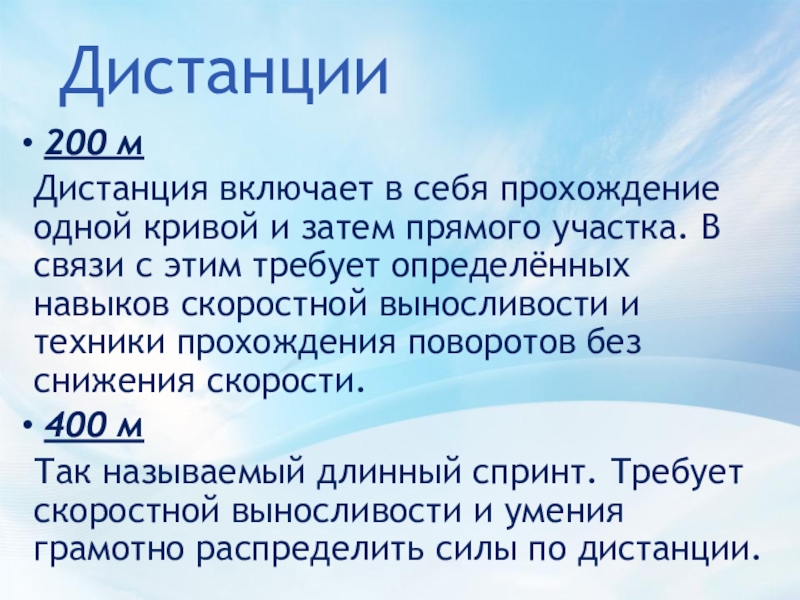 Так называемый длинный спринт. Требует скоростной выносливости и умения грамотно распределить силы по дистанции.