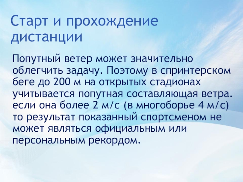 спринтерском беге до 200 м на открытых стадионах учитывается попутная составляющая ветра. если она более 2 м/c (в многоборье 4 м/c) то результат показанный спортсменом не может являться официальным или персональным рекордом.