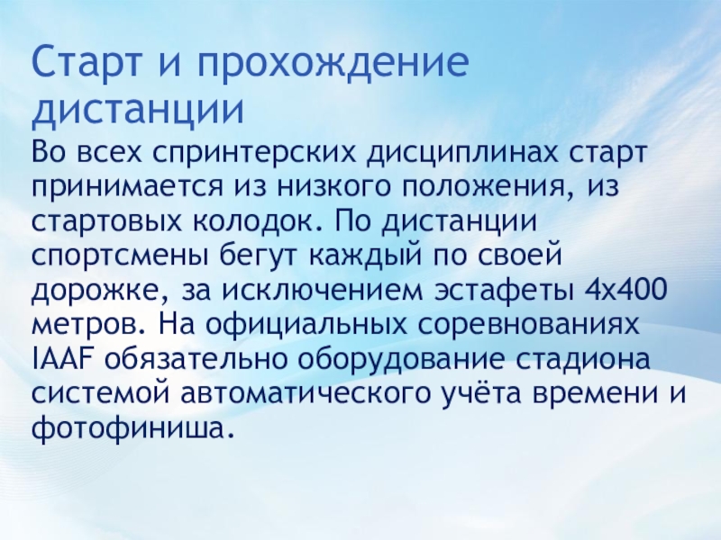 положения, из стартовых колодок. По дистанции спортсмены бегут каждый по своей дорожке, за исключением эстафеты 4x400 метров. На официальных соревнованиях IAAF обязательно оборудование стадиона системой автоматического учёта времени и фотофиниша.