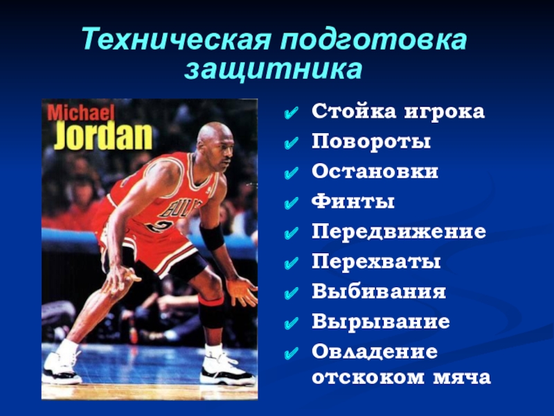 Стойка игрокаПоворотыОстановкиФинтыПередвижениеПерехватыВыбиванияВырываниеОвладение отскоком мячаТехническая подготовка защитника