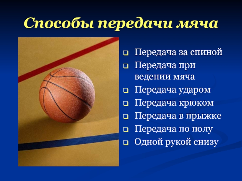 Способы передачи мячаДвумя руками от   грудиДвумя руками с отскокомДвумя руками снизуДвумя руками над головойБейсбольная (длинная)