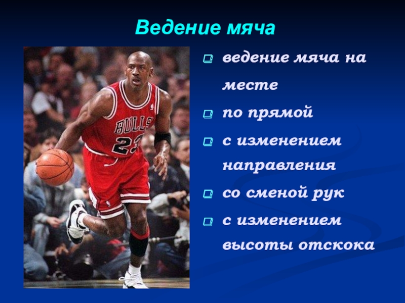 Ведение мячаведение мяча на  местепо прямойс изменением направлениясо сменой рукс изменением высоты отскока