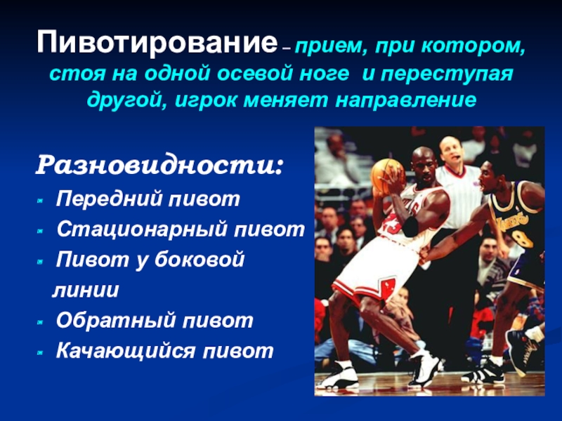 Пивотирование – прием, при котором, стоя на одной осевой ноге и переступая другой, игрок меняет направлениеРазновидности:Передний пивотСтационарный