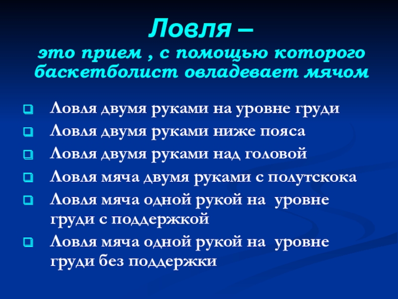 Ловля –  это прием , с помощью которого баскетболист овладевает мячомЛовля двумя руками на уровне груди