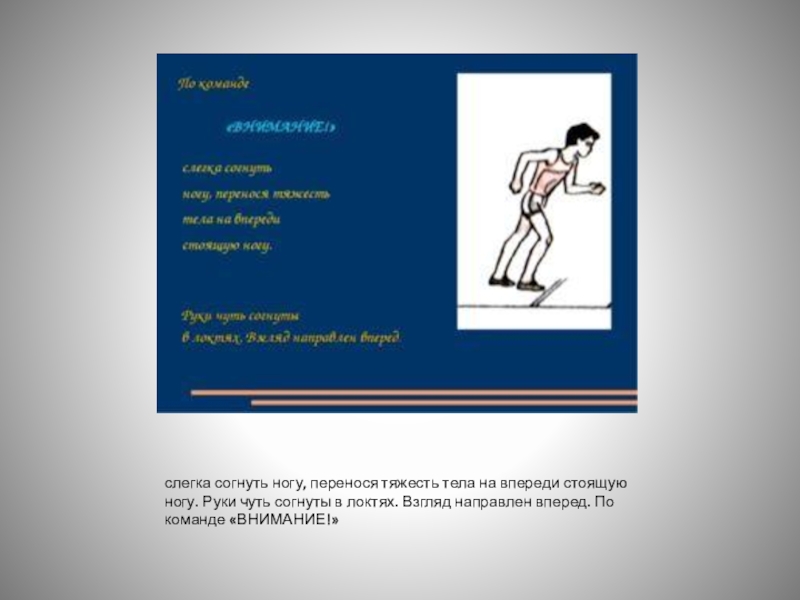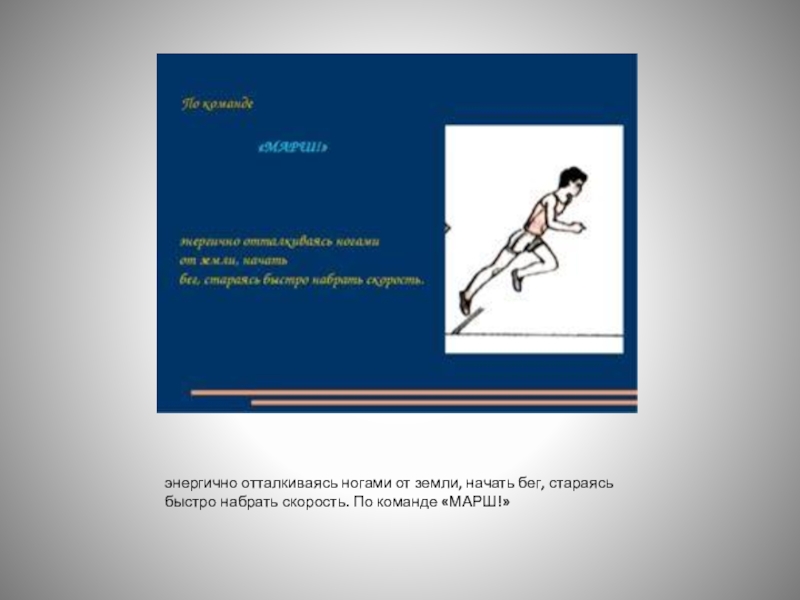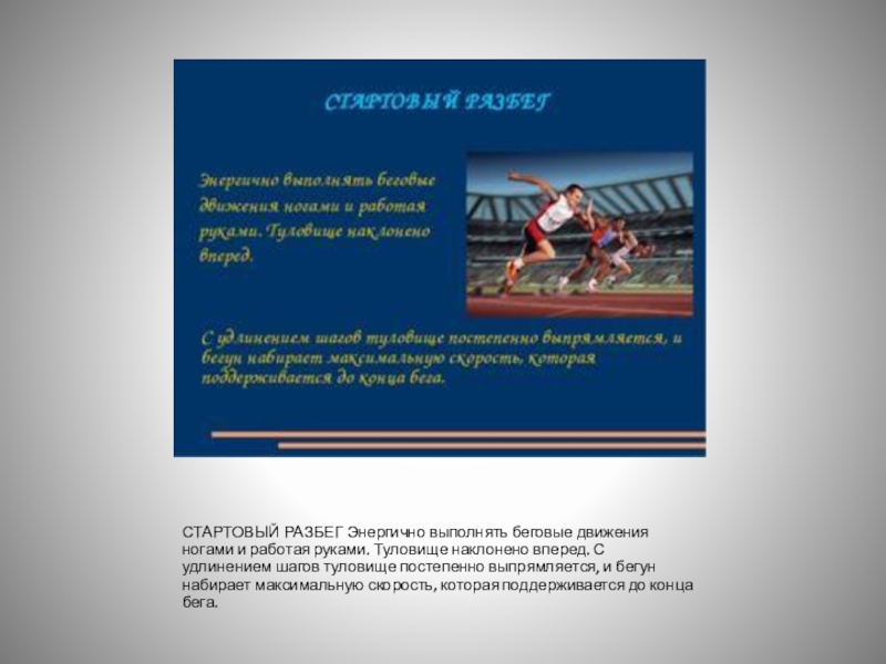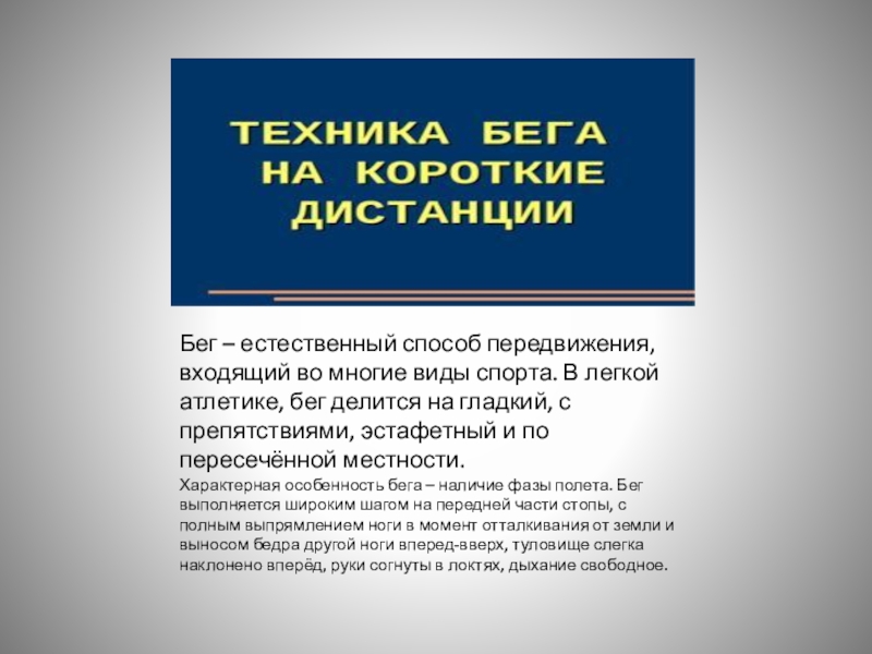 Характерная особенность бега – наличие фазы полета. Бег выполняется широким шагом на передней части стопы, с полным выпрямлением ноги в момент отталкивания от земли и выносом бедра другой ноги вперед-вверх, туловище слегка наклонено вперёд, руки согнуты в локтях, дыхание свободное.
