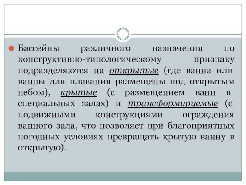 Бассейны различного назначения по конструктивно-типологическому признаку подразделяются на открытые (где ванна