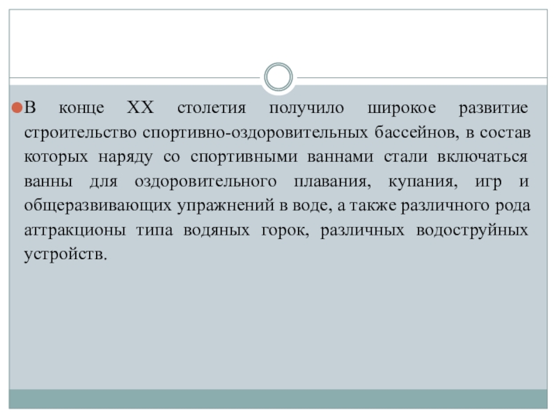 В конце XX столетия получило широкое развитие строительство спортивно-оздоровительных бассейнов, в