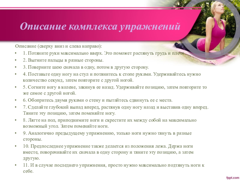 Описание комплекса упражнений Описание (сверху вниз и слева направо):1. Потяните руки максимально вверх. Это поможет растянуть грудь