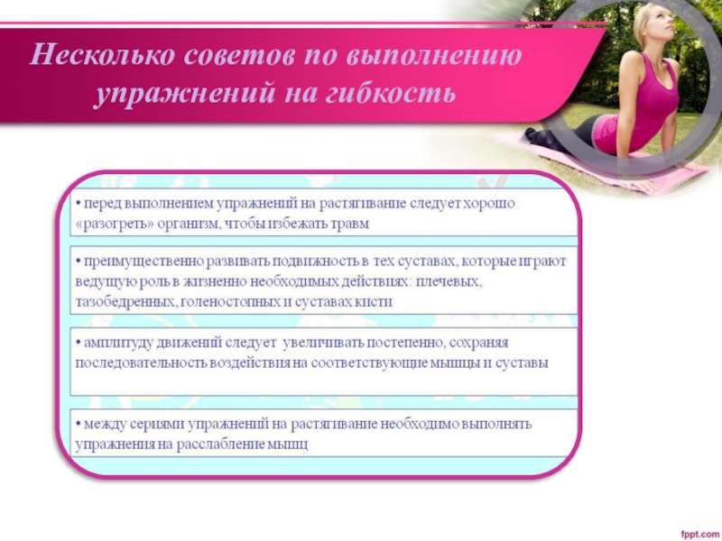 Слайд 6Несколько советов по выполнению упражнений на гибкость