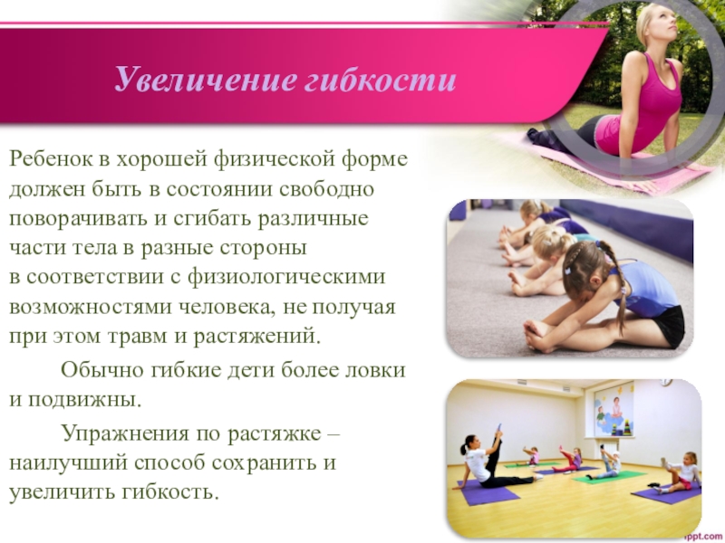 Увеличение гибкости  Ребенок в хорошей физической форме должен быть в состоянии свободно поворачивать и сгибать различные части тела в разные стороны в соответствии с физиологическими возможностями человека,