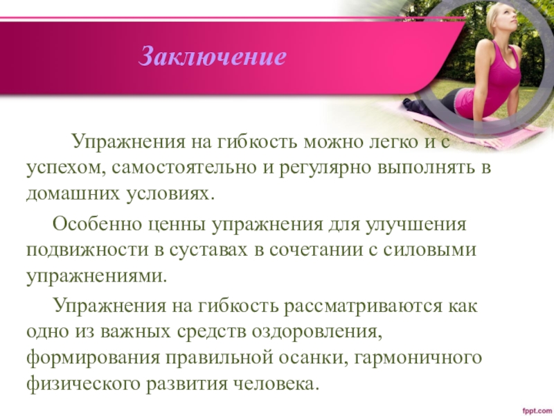 Заключение   Упражнения на гибкость можно легко и с успехом, самостоятельно и регулярно выполнять в домашних