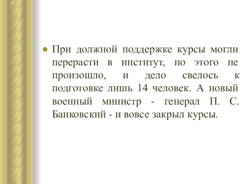 произошло, и дело свелось к подготовке лишь 14 человек. А новый военный министр - генерал П. С. Банковский - и вовсе закрыл курсы.