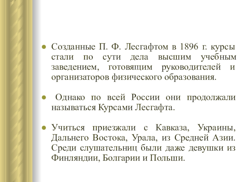 Созданные П. Ф. Лесгафтом в 1896 г. курсы стали по сути