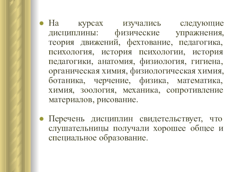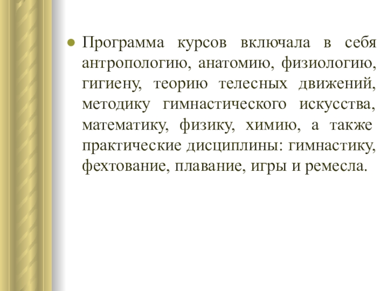 Программа курсов включала в себя антропологию, анатомию, физиологию, гигиену, теорию телесных