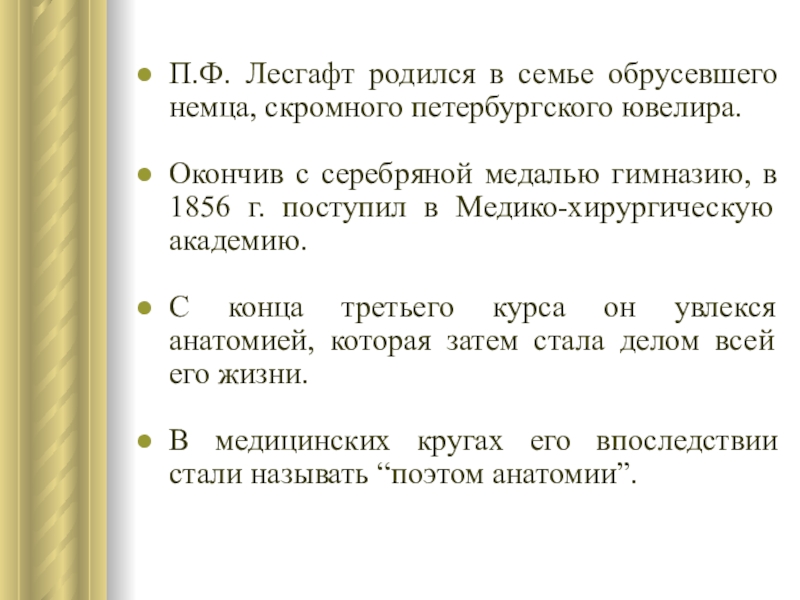 Слайд 8П.Ф. Лесгафт родился в семье обрусевшего немца, скромного петербургского ювелира.