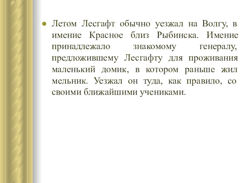 Летом Лесгафт обычно уезжал на Волгу, в имение Красное близ Рыбинска.