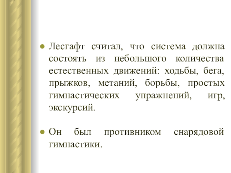 Лесгафт считал, что система должна состоять из небольшого количества естественных движений: