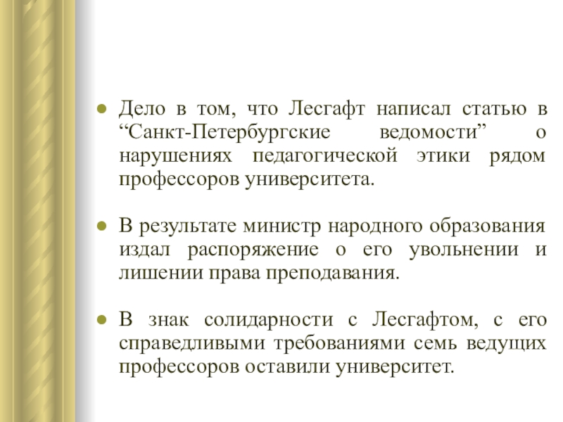 В знак солидарности с Лесгафтом, с его справедливыми требованиями семь ведущих профессоров оставили университет.