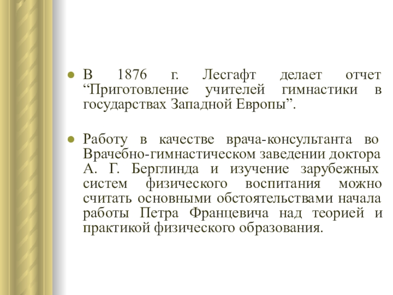 В 1876 г. Лесгафт делает отчет “Приготовление учителей гимнастики в государствах