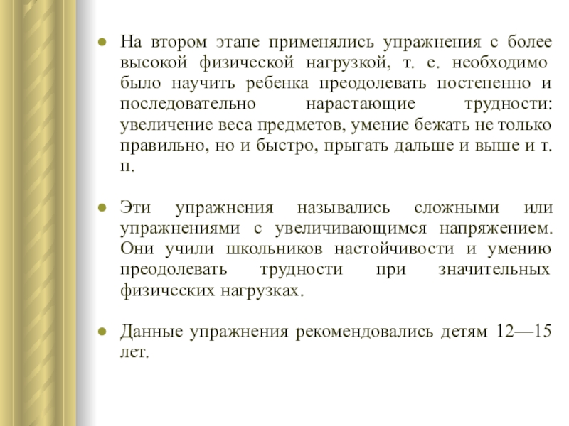 Эти упражнения назывались сложными или упражнениями с увеличивающимся напряжением. Они учили школьников настойчивости и умению преодолевать трудности при значительных физических нагрузках.