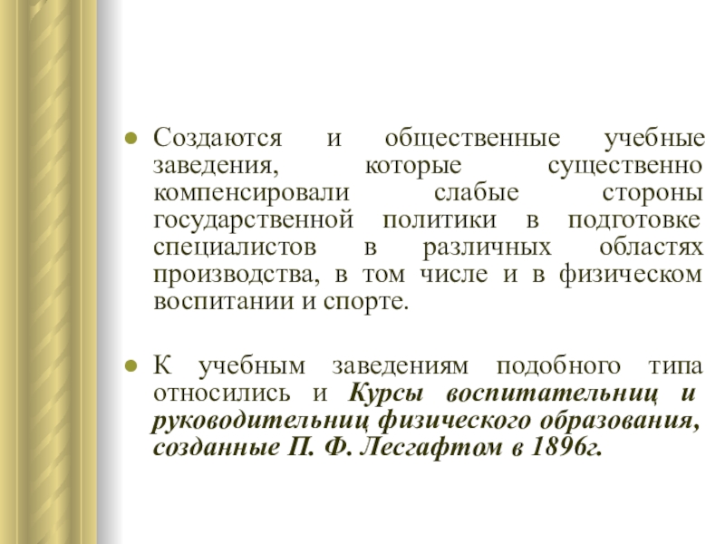 К учебным заведениям подобного типа относились и Курсы воспитательниц и руководительниц физического образования, созданные П. Ф. Лесгафтом в 1896г.