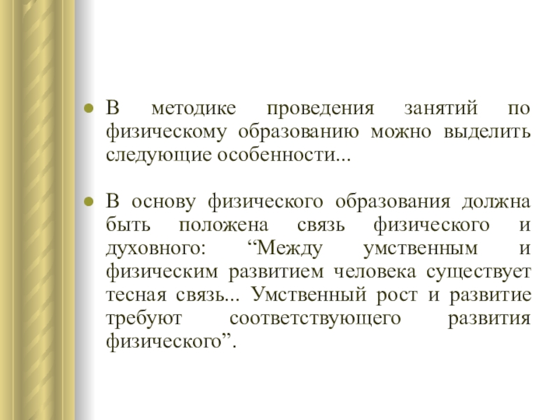 В основу физического образования должна быть положена связь физического и духовного: “Между умственным и физическим развитием человека существует тесная связь... Умственный рост и развитие требуют соответствующего развития физического”.