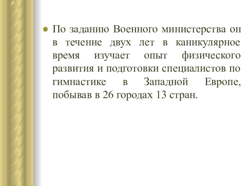 время изучает опыт физического развития и подготовки специалистов по гимнастике в Западной Европе, побывав в 26 городах 13 стран.