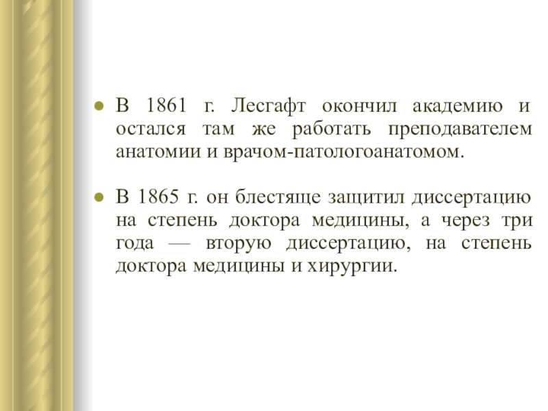 В 1865 г. он блестяще защитил диссертацию на степень доктора медицины, а через три года — вторую диссертацию, на степень доктора медицины и хирургии.