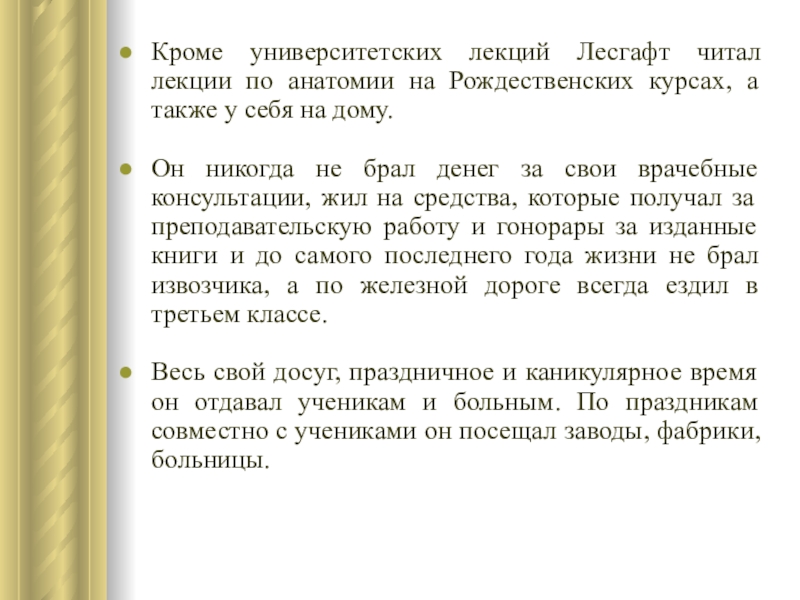 Кроме университетских лекций Лесгафт читал лекции по анатомии на Рождественских курсах,