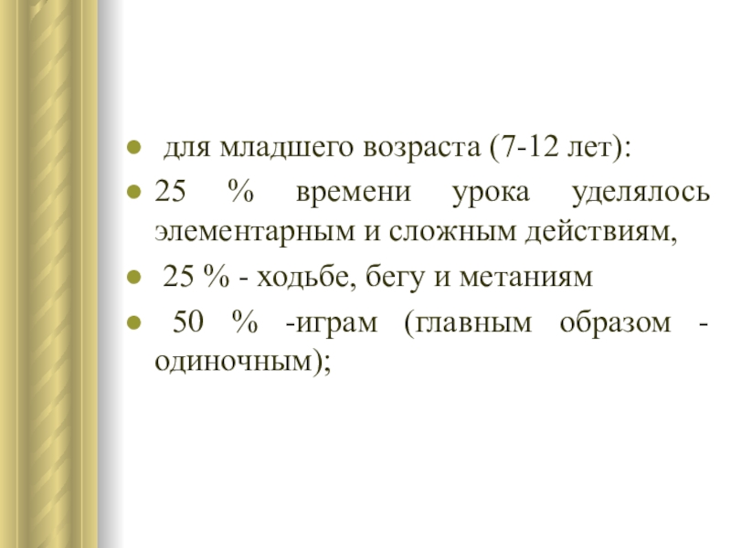 игры и требовал придерживаться правила: “...Кто шумит - выходи вон из игры и жди, пока она закончится...”, положительно относился к подвижным играм, которые подбирались в соответствии с целью занятия, отрицал применение гимнастических снарядов и массажа, так как они “...дают вредные добавочные раздражители”.