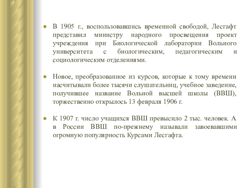 Новое, преобразованное из курсов, которые к тому времени насчитывали более тысячи слушательниц, учебное заведение, получившее название Вольной высшей школы (ВВШ), торжественно открылось 13 февраля 1906 г.