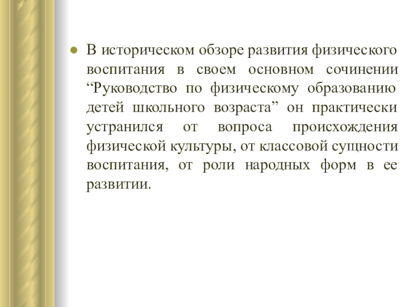 по физическому образованию детей школьного возраста” он практически устранился от вопроса происхождения физической культуры, от классовой сущности воспитания, от роли народных форм в ее развитии.