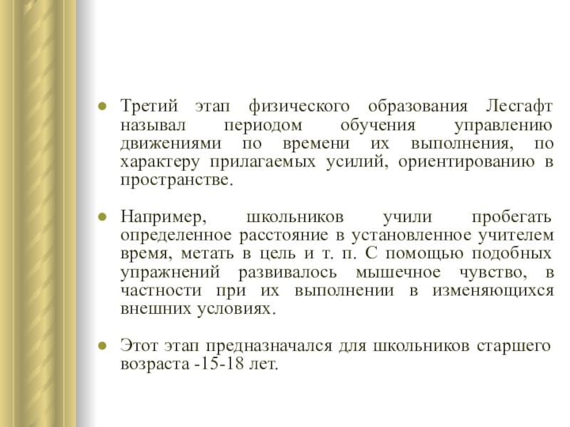 Третий этап физического образования Лесгафт называл периодом обучения управлению движениями по