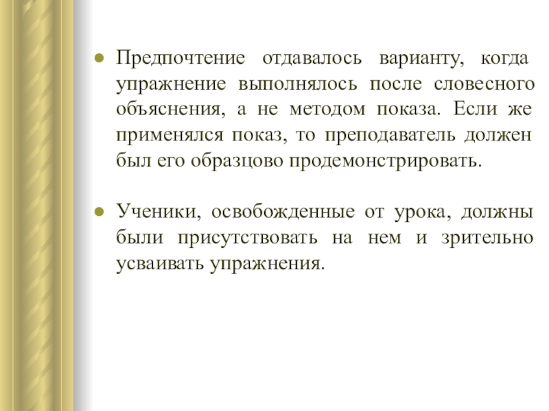 Ученики, освобожденные от урока, должны были присутствовать на нем и зрительно усваивать упражнения.