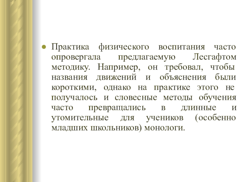 Практика физического воспитания часто опровергала предлагаемую Лесгафтом методику. Например, он требовал,