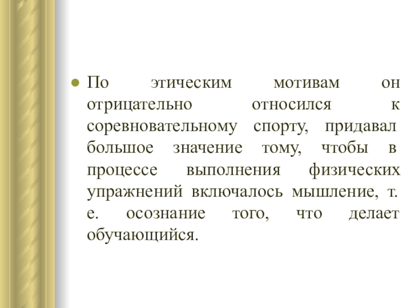 По этическим мотивам он отрицательно относился к соревновательному спорту, придавал большое