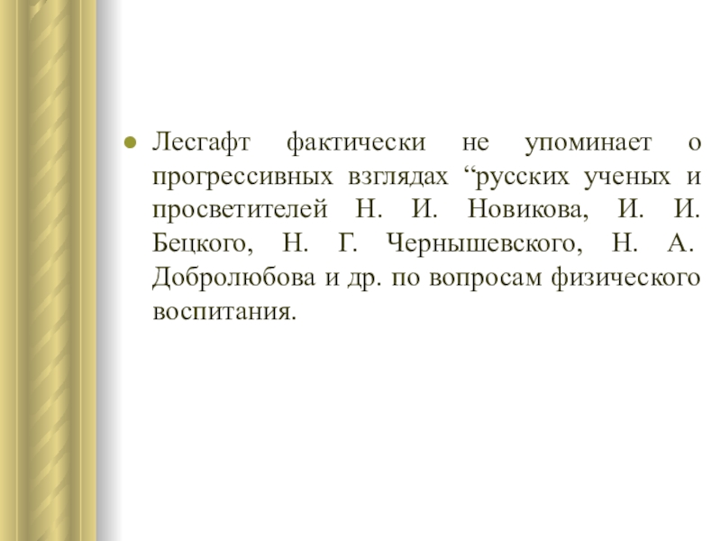 Лесгафт фактически не упоминает о прогрессивных взглядах “русских ученых и просветителей