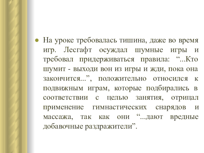 На уроке требовалась тишина, даже во время игр. Лесгафт осуждал шумные
