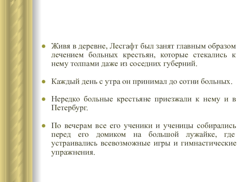 Живя в деревне, Лесгафт был занят главным образом лечением больных крестьян,