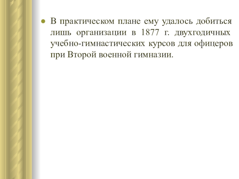 В практическом плане ему удалось добиться лишь организации в 1877 г.