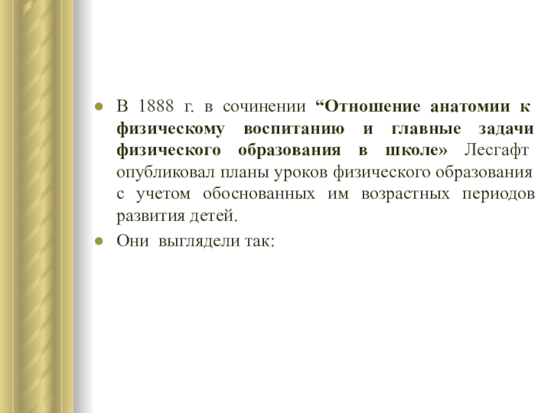В 1888 г. в сочинении “Отношение анатомии к физическому воспитанию и