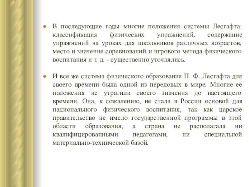 И все же система физического образования П. Ф. Лесгафта для своего времени была одной из передовых в мире. Многие ее положения не утратили своего значения до настоящего времени. Она, к сожалению, не стала в России основой для национального физического воспитания, так как царское правительство не имело государственной программы в этой области образования, а страна не располагала ни квалифицированными педагогами, ни специальной материально-технической базой.