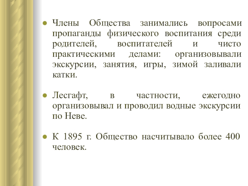 Члены Общества занимались вопросами пропаганды физического воспитания среди родителей, воспитателей и