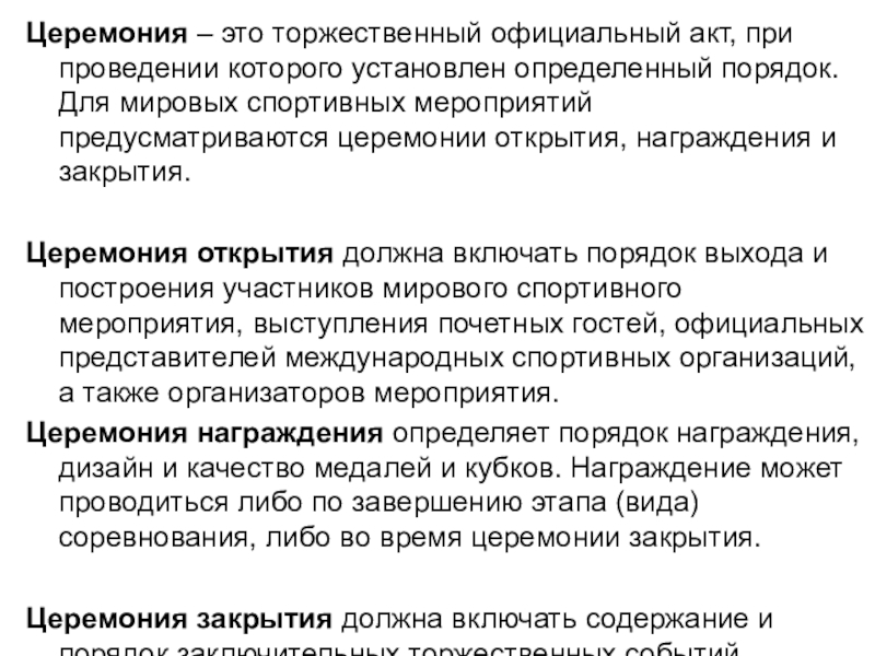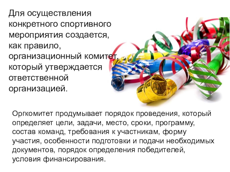 Оргкомитет продумывает порядок проведения, который определяет цели, задачи, место, сроки, программу, состав команд, требования к участникам, форму участия, особенности подготовки и подачи необходимых документов, порядок определения победителей, условия финансирования.