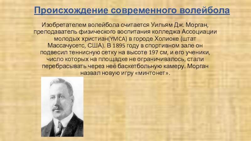 Происхождение современного волейболаИзобретателем волейбола считается Уильям Дж. Морган, преподаватель физического воспитания колледжа Ассоциации молодых христиан(YMCA) в городе Холиоке (штат Массачусетс, США). В 1895