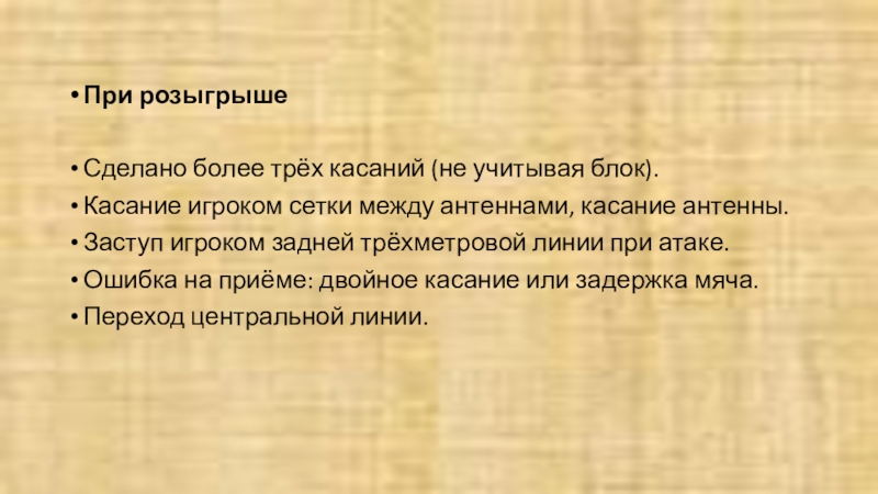 При розыгрыше Сделано более трёх касаний (не учитывая блок).Касание игроком сетки между антеннами, касание антенны.Заступ игроком задней трёхметровой