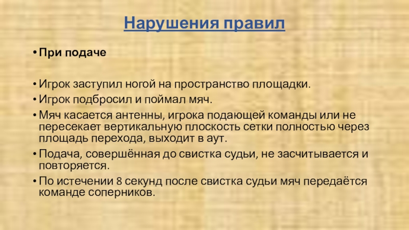 Нарушения правил При подачеИгрок заступил ногой на пространство площадки.Игрок подбросил и поймал мяч.Мяч касается антенны, игрока подающей