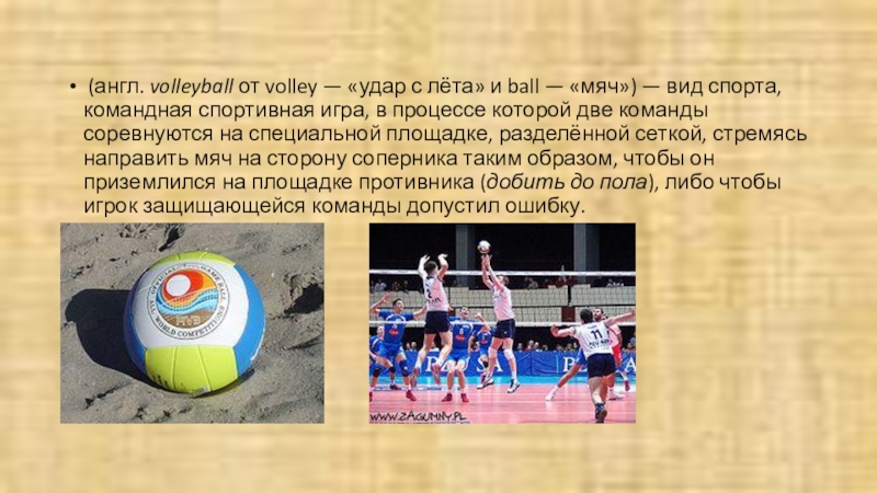 (англ. volleyball от volley — «удар с лёта» и ball — «мяч») — вид спорта, командная спортивная игра, в процессе которой две команды
